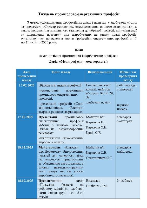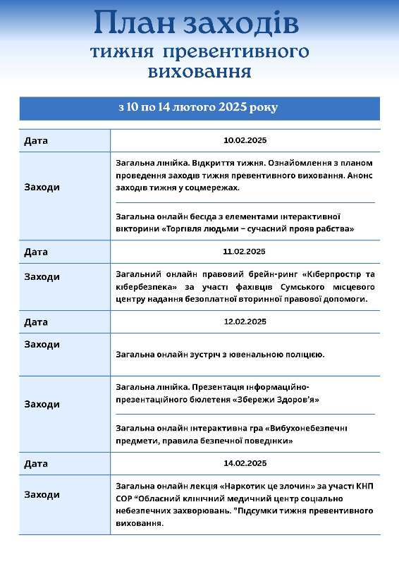 З метою формування здорового способу життя підростаючого покоління, профілактики правопорушень і злочинності серед неповнолітніх, булінгу і кібербулінгу, дотримання правил безпечної поведінки з вибухонебезпечними предметами у закладі організовується проведення тижня превентивного виховання здобувачів освіти з 10 по 14 лютого 2025 року.